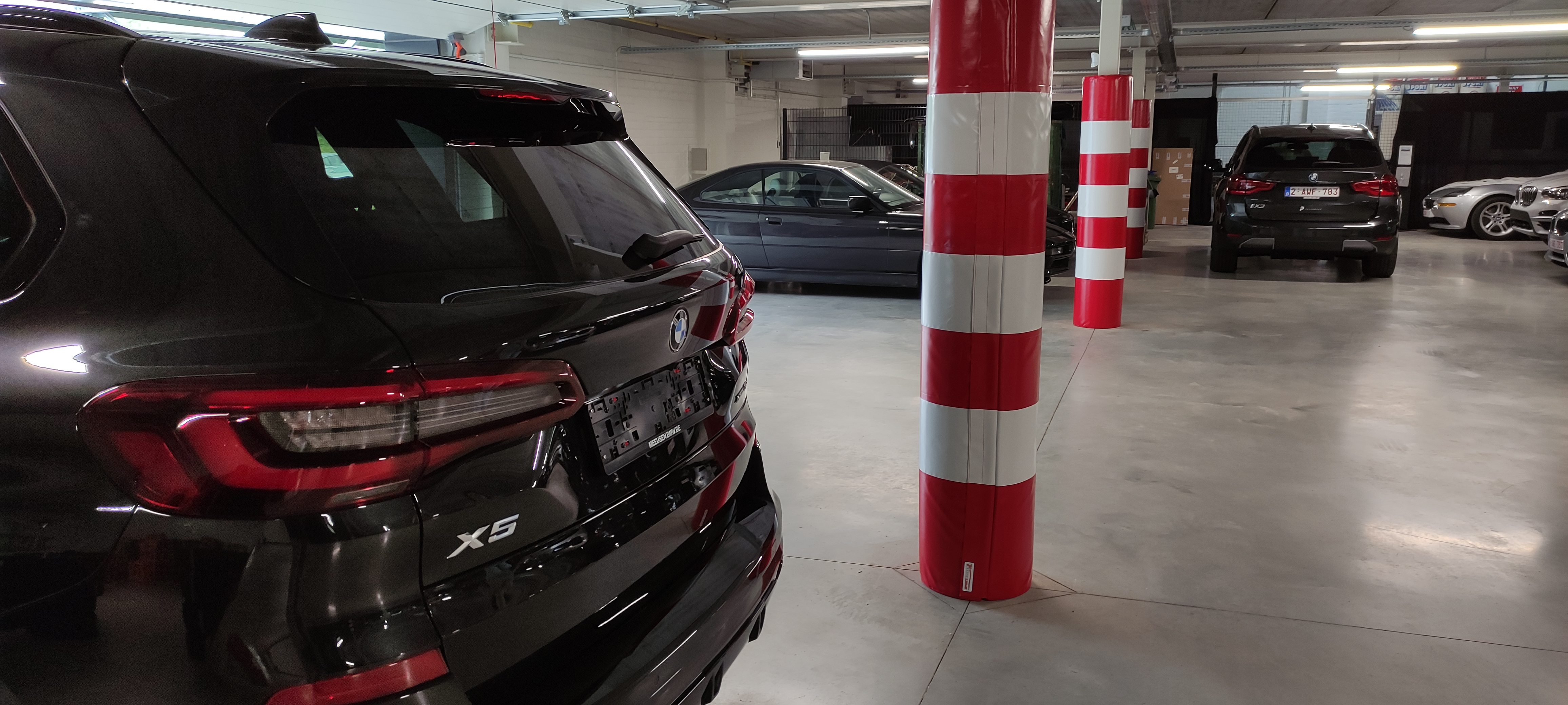 BMW dealer Meeusen in Kalmthout heeft haar hal waar de nieuwe auto's binnenkomen extra bescherming gegeven door twaalf witte steunpilaren te voorzien van een eigen ontworpen curbstones paalprotectie. Een origineel eigen idee. Zeker in een ruimte waar een grote overheaddeur veel daglicht binnenlaat, worden de witte palen nog wel eens over het hoofd gezien. Een kleine aanrijding kan een grote schadepost opleveren. Een eigen schade die de verzekering dan ook niet vergoed.